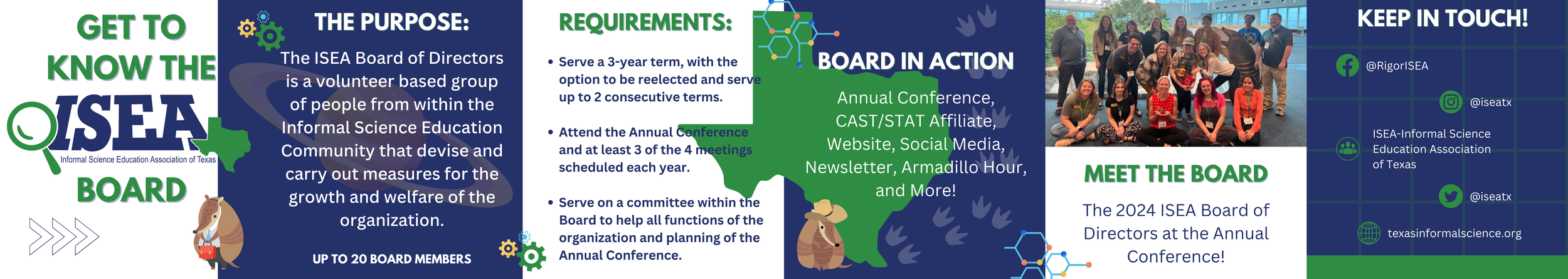 The ISEA board of directors are volunteers who represent the diverse range of informal science institutions through out Texas. From museums, zoos, aquariums, botanic gardens, parks service, nonprofits, and academia, the board includes folks from all stages in their careers. As part of their service, the ISEA board coordinates the annual ISEA conference, the organization’s presence at CAST, and ongoing efforts to network with and connect informal science educators across the state. ISEA recruits new board members each year immediately following the conference in February. Each member serves a 3-year term with ability to serve two consecutive terms.