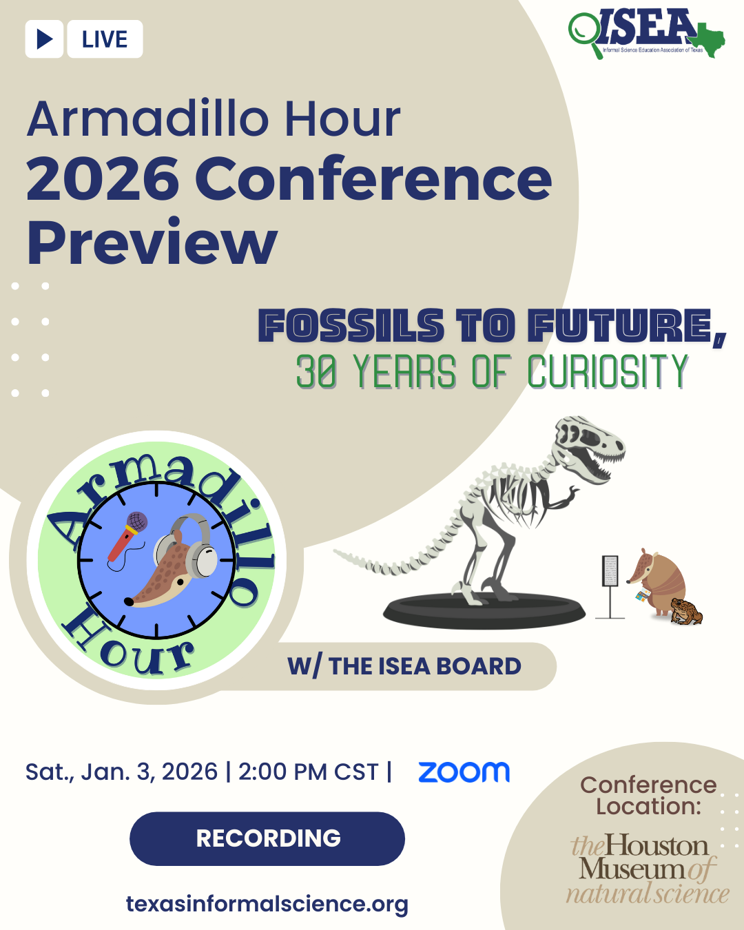 Kick off the New Year with ISEA for a Special Conference Preview hosted by ISEA Board President, Katie Boughal on Saturday, Jan. 3, 2026 at 2PM. During this Armadillo Hour, the ISEA Board will share information about the upcoming 30th Annual ISEA Conference, Fossils to Future, 30 Years of Curiosity. Information shared will include details about the conference venue, keynote speakers, session topics and more! Participants will also be able to ask questions and virtually meet other conference attendees and ISEA Board Members.